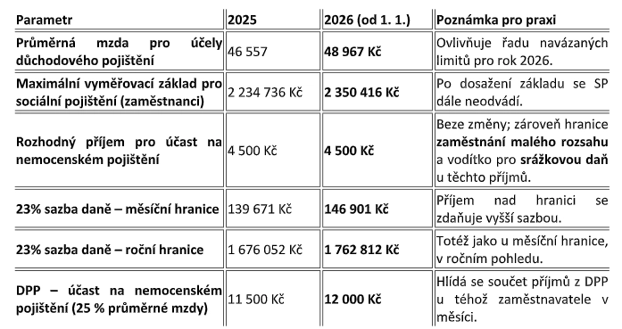 V souvislosti s vyhlášením všeobecného vyměřovacího základu za rok 2024 a přepočítacího koeficientu 1,0581 se zvyšuje také průměrná mzda pro rok 2026 na 48 967 Kč. Vyhlašovaná průměrná mzda ovlivňuje řadu dalších parametrů. Například výši základní výměry starobního důchodu, minimální zálohy OSVČ na zdravotní pojištění, minimální zálohy OSVČ na důchodové pojištění pro hlavní činnost nebo částku rozhodného měsíčního příjmu pro účast zaměstnanců na nemocenském pojištění. Dále je průměrná mzda základní veličinou pro progresivní zdanění fyzických osob a pro osvobození takzvaných volnočasových benefitů od daně z příjmů ze závislé činnosti.