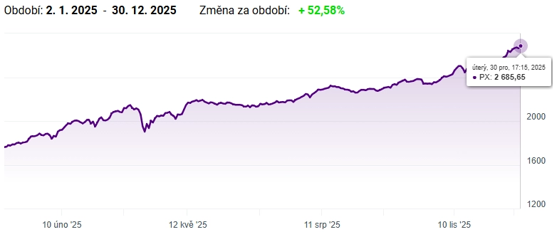 "Rok 2025 byl pro index PX druhým nejlepším rokem v historii, lepší byl jen výsledek za rok 2004. Při započtení dividend dosáhlo letošní zhodnocení dokonce 61,34 %," říká analytik z Komerční banky Bohumil Trampota. "Celkový zobchodovaný objem letos podstatně nabobtnal, dosáhl skoro 170 miliard korun, což představuje meziroční nárůst o téměř 57 %," doplnil.