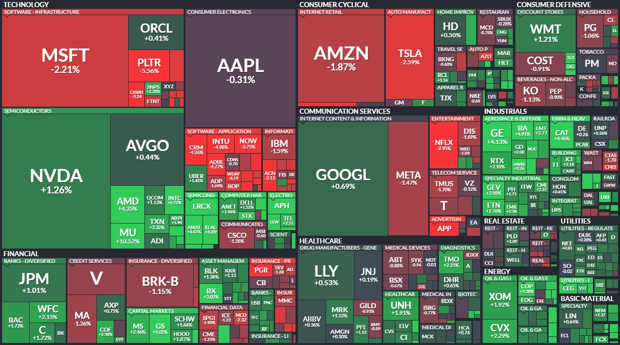 Posílily akcie klíčových výrobců čipů, jako jsou NVIDIA (+1,26 %), Micron Technology (+10,52 %), AMD (+4,35 %) nebo Intel (+6,72 %). Dařilo se také akciím firem z průmyslového odvětví, mimo jiné Boeingu (+4,91 %) nebo Caterpillaru (+4,46 %). Naopak pod tlakem byly cenné papíry softwarových firem, jako jsou Salesforce (-4,26 %), Crowdstrike Holdings (-3,24 %) či Palantir Technologies (-5,56 %) a Microsoft (-2,21 %).