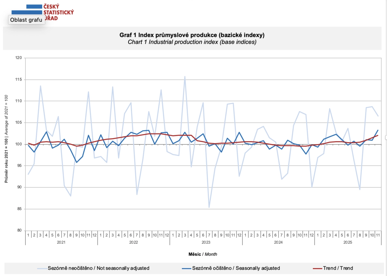 Průmyslová produkce v Česku v listopadu pokračovala v růstu. Meziročně se zvýšila o 5,7 % a meziměsíčně o 2,4 %. K růstu přispěla především výroba motorových vozidel a kovozpracující průmysl.