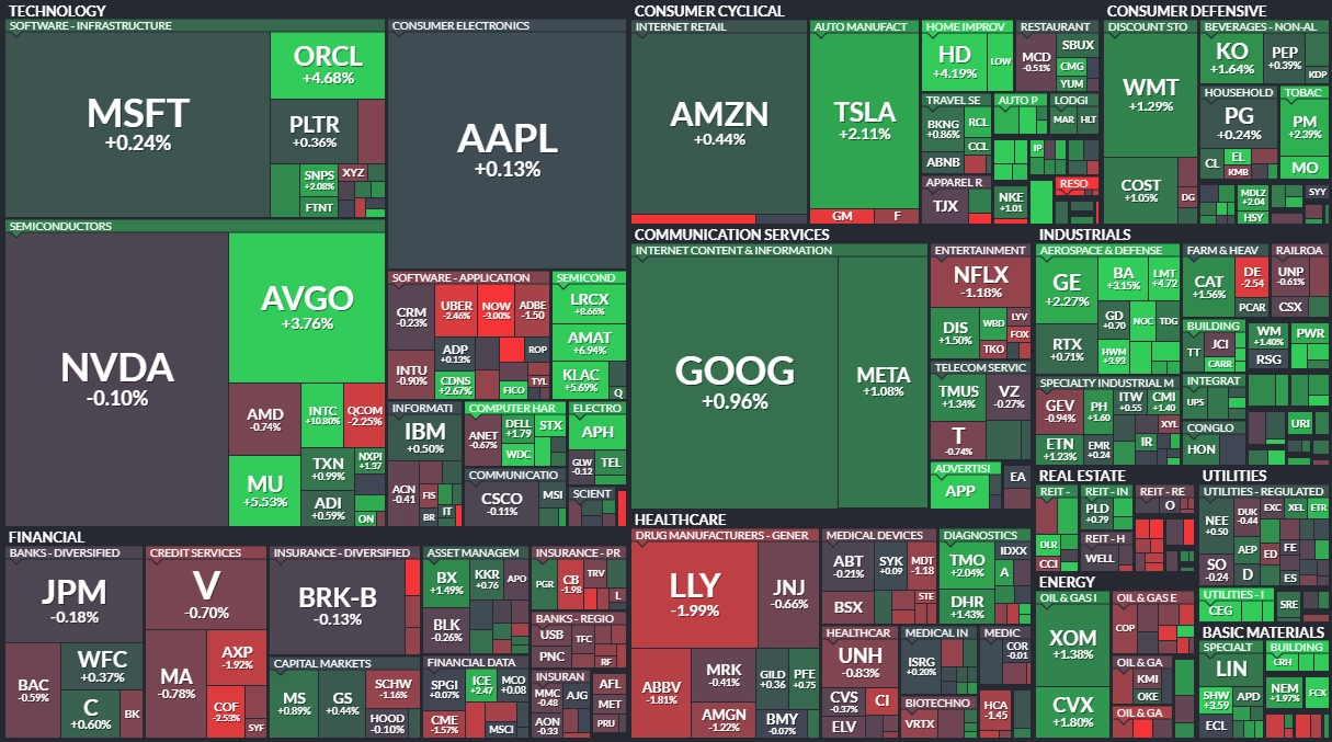 Index Dow v pátek přidal 0,48 % na nové zavírací maximum 49 504,07 bodu, širší S&P 500 se zvýšil o 0,65 % na rekordních 6 966,28 bodu a index technologického trhu Nasdaq Composite uzavřel se ziskem 0,81 % na 23 671,35 bodu. S&P 500 navýšil i absolutní maximum, a to na 6 978,36 bodu.