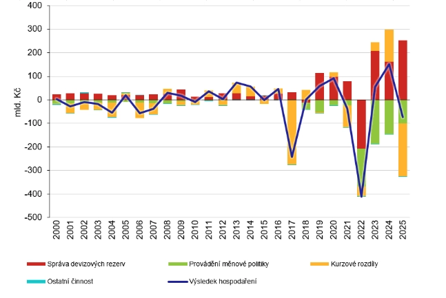 Po dvou letech ziskového hospodaření skončila Česká národní banka v roce 2025 ve ztrátě bezmála 73 miliard Kč. Rozhodující roli sehrál kurzový vývoj – koruna během roku výrazně posílila k hlavním rezervním měnám, zejména k americkému dolaru, vůči němuž zpevnila o 14,8 %. Kurzové ztráty tak převážily nad velmi silným zhodnocením devizových rezerv.