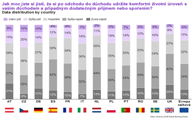 Obavy z poklesu životní úrovně řeší napříč Evropou 47 % lidí. Největší nedůvěra panuje v Británii, Nizozemsku a Španělsku, kde se nejistě cítí více než polovina obyvatel. V Česku zhruba třicet procent lidí věří, že jejich finanční situace v penzi zůstane stabilní, v rámci EU jde o nadprůměrné číslo.