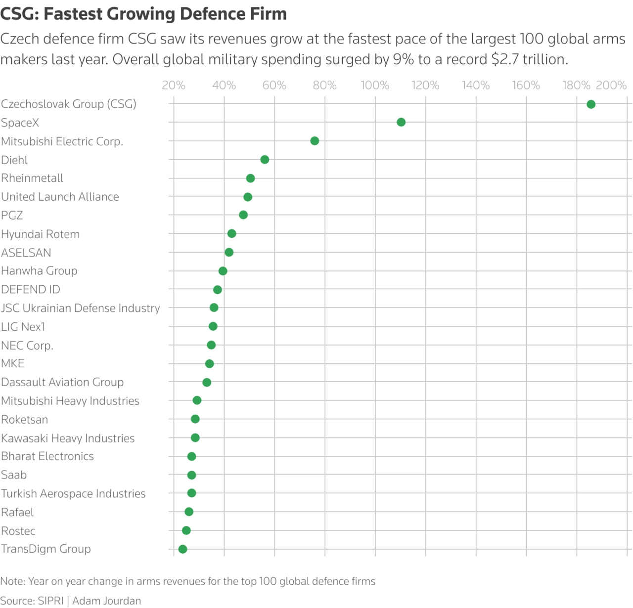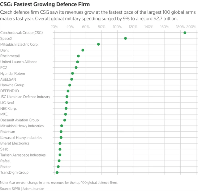 Czechoslovak Group je podle agentury Reuters rovnou nejrychleji rostoucí obrannou firmou v Evropě. A to podle meziročního růstu tržeb na globálním trhu, jehož hodnota v roce 2024 dosáhla 2,7 bilionu dolarů. Společnost působí ve více než 70 zemích a provozuje 39 výrobních závodů v Evropě, Spojených státech a Indii.