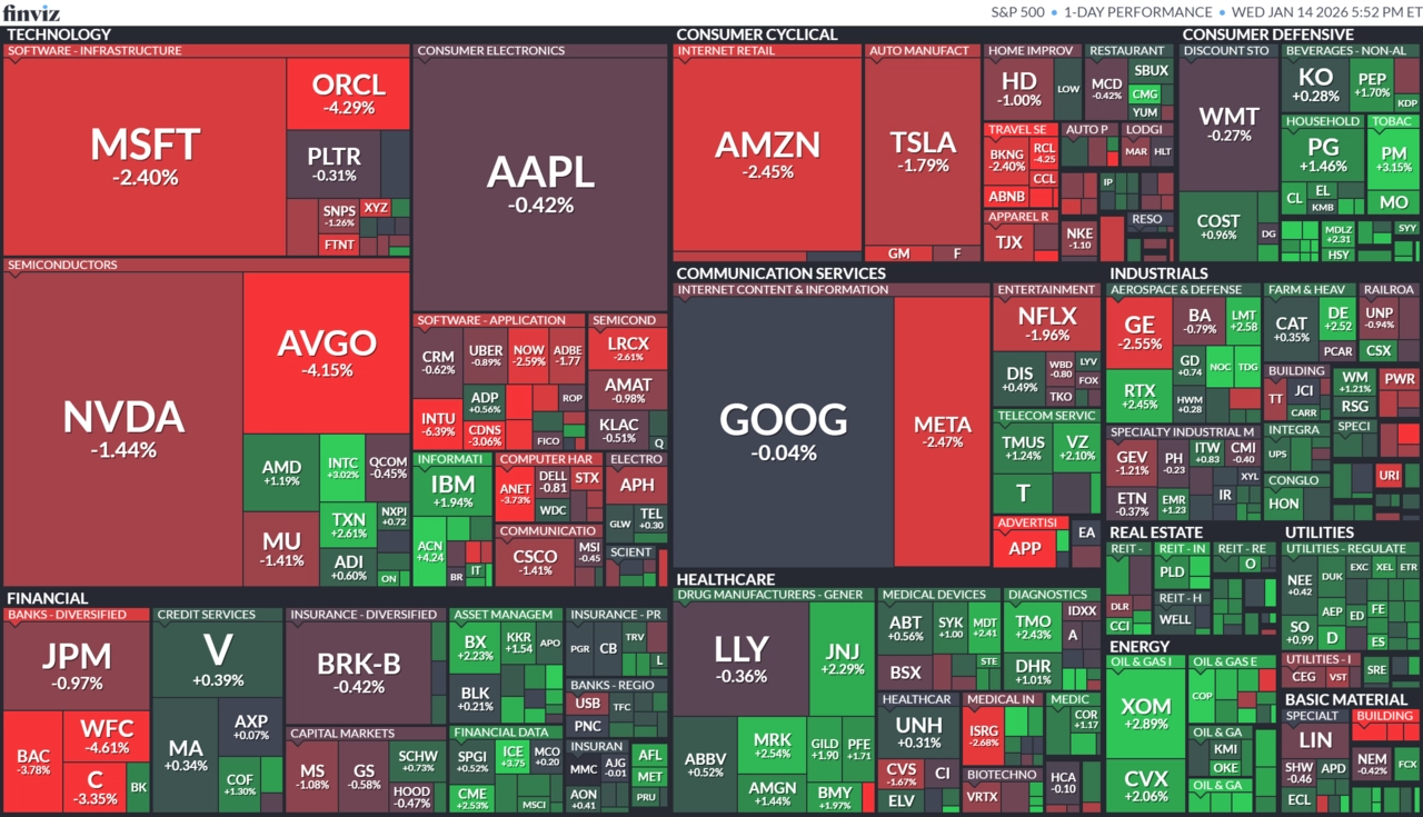 Pod tlakem byly i bankovní tituly. Wells Fargo (-4,61 %) ztrácela poté, co zveřejnila slabší než očekávané tržby za čtvrté čtvrtletí. Akcie Bank of America (-3,78 %) a Citigroup (-3,34 %) oslabily i přes oznámení výsledků nad odhady analytiků. Investoři je zřejmě nepovažovali za dostatečně silné na to, aby podpořily trh poblíž historických maxim. Ztráty bank se navíc prohlubují v kontextu výroků prezidenta Donalda Trumpa o reformě úrokových sazeb kreditních karet.