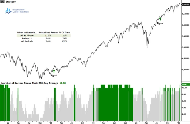 Americký akciový býk je na tom v současnosti velice dobře. Všech jedenáct hlavních sektorů širokého indexu S&P 500 je nad svým 200denním průměrem. Historicky jde o situaci, ve které se indexu daří nejlépe (anualizovaný růst o 11,5 %).