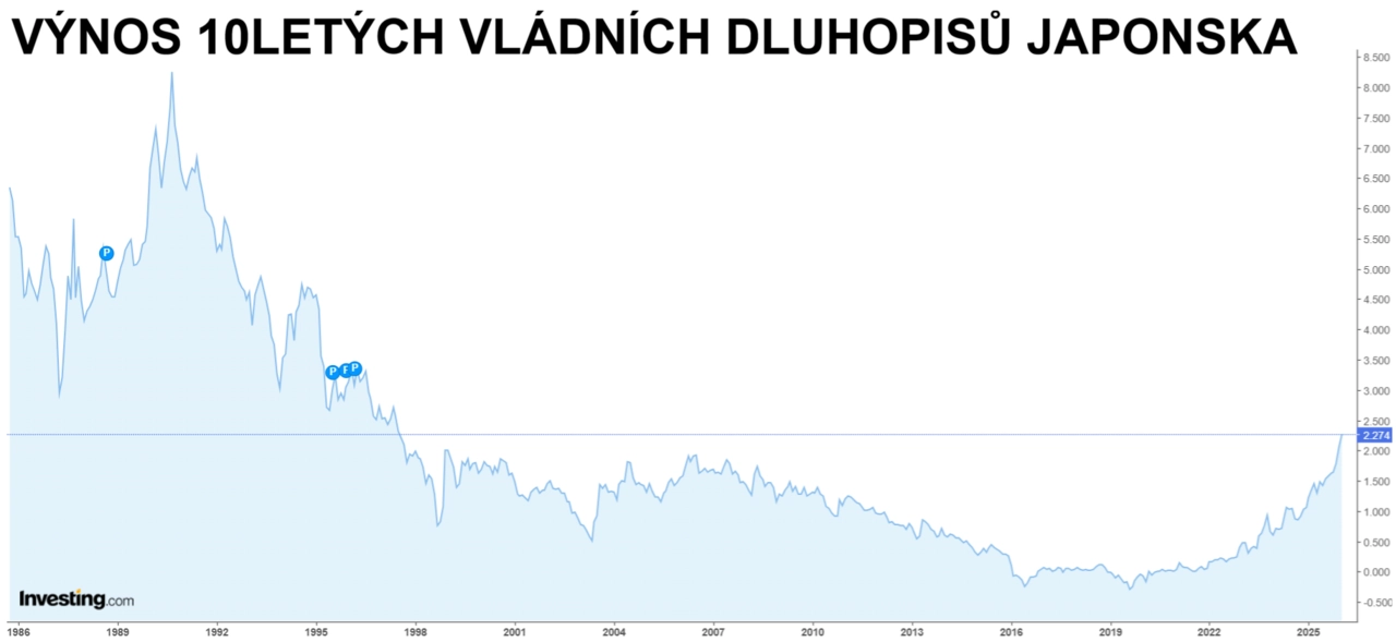 Rychlý růst výnosů japonských vládních dluhopisů, které jsou na nejvyšších úrovních za desítky let, spolu s postupným zpřísňováním politiky centrální banky narušuje dlouhodobě klíčový carry trade založený na levném japonském jenu. Právě tento mechanismus, kdy si investoři půjčují s nízkým úrokem v jenech a nakupují lépe úročená aktiva denominovaná v jiných měnách, po léta zlevňoval globální financování, podporoval poptávku po akciích i dluhopisech a stlačoval výnosy po celém světě.