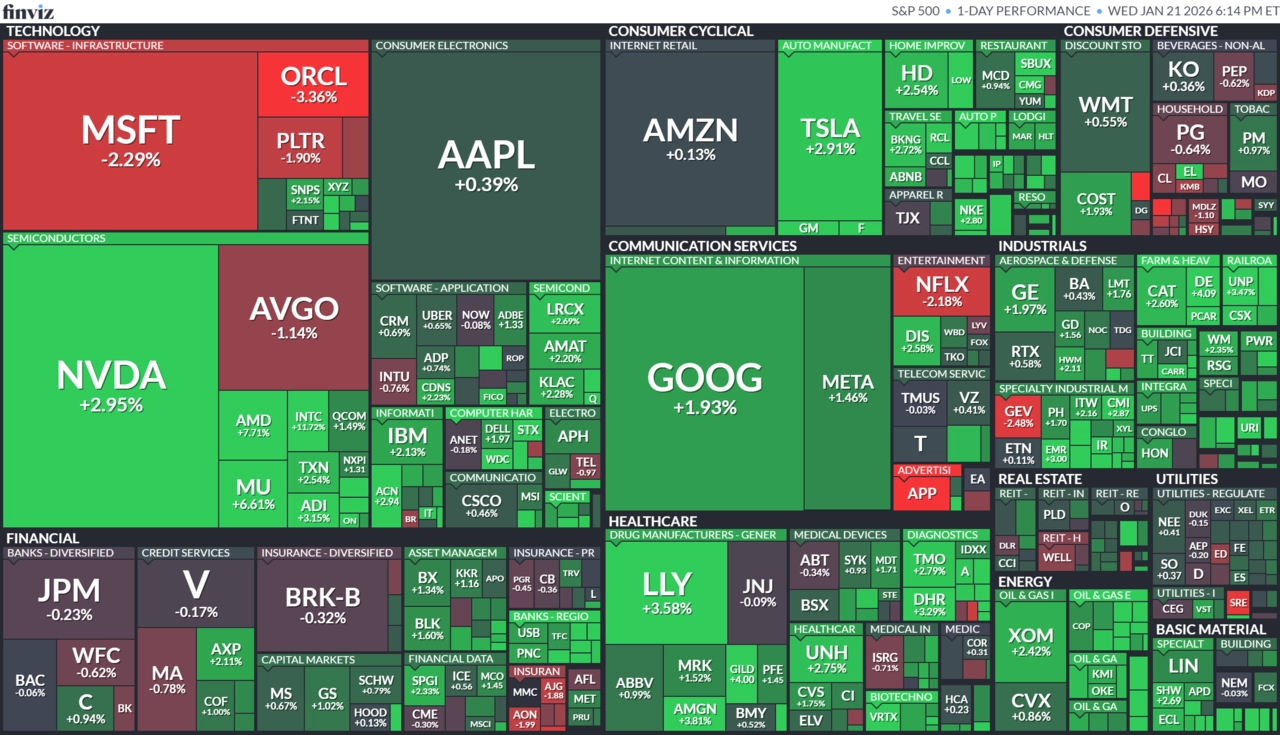 Americké akciové indexy ve středu vzrostly poté, co Donald Trump nejprve vyloučil použití vojenské síly k získání Grónska a později oznámil, že pozastaví zavedení nových cel vůči osmi evropským zemím. Uvedl, že byl dojednán rámec dohody týkající se Grónska a spolupráce zemí NATO v širším arktickém regionu, což snížilo obavy investorů z další eskalace obchodního konfliktu.