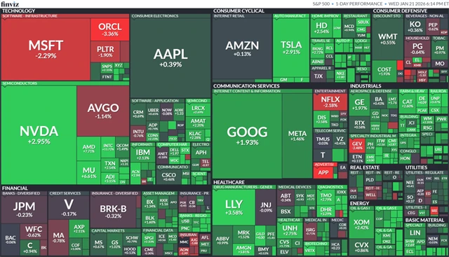 Akciové indexy rostly hned v úvodu seance poté, co Donald Trump v Davosu prohlásil, že nehodlá použít vojenskou sílu k získání Grónska. Tato slova zmírnila geopolitické napětí, které v předchozích dnech výrazně zatěžovalo finanční trhy. Trump později na sociální síti Truth Social napsal, že po jednání s generálním tajemníkem NATO Markem Ruttem vznikl rámec budoucí dohody o spolupráci v Arktidě, a proto dovozní cla pro osm evropských zemí, které do Grónska dříve vyslaly na cvičení své vojáky, plánovaná od 1. února nebudou zavedena. Pro CNBC pak dodal, že existuje koncept dohody se samotným Grónskem.