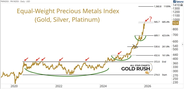 Podstatné přitom podle něj je, růst cen je velice přesvědčivý a probíhá skoro kontinuálně, ne pouze v obdobích, kdy se zhoršuje geopolitická nebo ekonomická situace. "Velice ilustrativní je rovnoměrně vážený index cen drahých kovů, který dává stejnou váhu zlatu, stříbru a platině. Index na začátku roku 2024 prorazil nad několikaleté pásmo konsolidace a nastoupil cestu vzhůru. Od té doby je jeho vývoj ukázkou býčího trendu," popisuje Perz.
