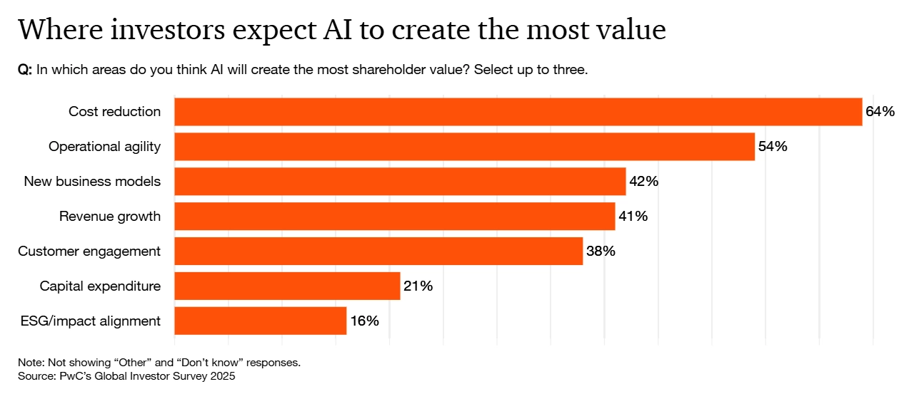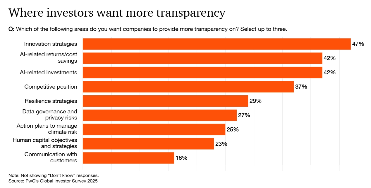 Díky využívání AI došlo v podnicích, do kterých oslovení investovali v posledním roce, ke zlepšení produktivity (86 %), ziskovosti (71 %) i výnosů (66 %). Na základě těchto výsledků tři ze čtyř (78 %) respondentů uvádějí, že by alespoň mírně zvýšili své investice do podniků, které usilují o transformaci umělou inteligencí v celé firmě. Investoři ale požadují větší transparentnost, aby mohli dělat informovaná rozhodnutí. Ani ne dvě pětiny (37 %) oslovených uvádí, že společnosti zveřejňují dostatek informací o strategiích a politice v oblasti AI.
