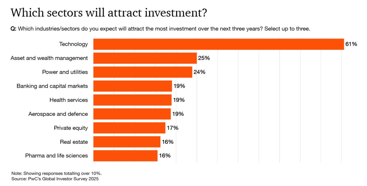 Technologický sektor je výrazně atraktivnější než jakýkoli jiný. Zatímco na technologie sází 61 % investorů, další sektory jako energetika (24 %) nebo bankovnictví a finanční trhy (19 %) lákají jen menší část z nich. Vyplývá to z průzkumu PwC Global Investors Survey.