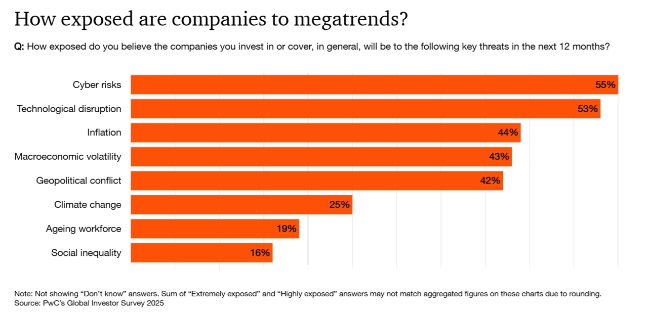 Konzervativní očekávání růstu lze částečně vysvětlit hodnocením hrozeb. Více než polovina respondentů (55 %) popisuje vysokou nebo extrémní míru vystavení kybernetickým rizikům a téměř stejný podíl (53 %) vyjadřuje obavu z příliš rychlých technologických změn. Inflace (44 %), makroekonomická volatilita (43 %) a geopolitické konflikty (42 %) ovlivňují sentiment také negativně. Ještě před dvěma lety se investoři nejvíce báli inflace a globálního ekonomického vývoje, teď už převládají obavy z kybernetických rizik nebo rychlého zavádění AI.