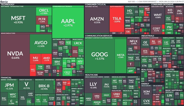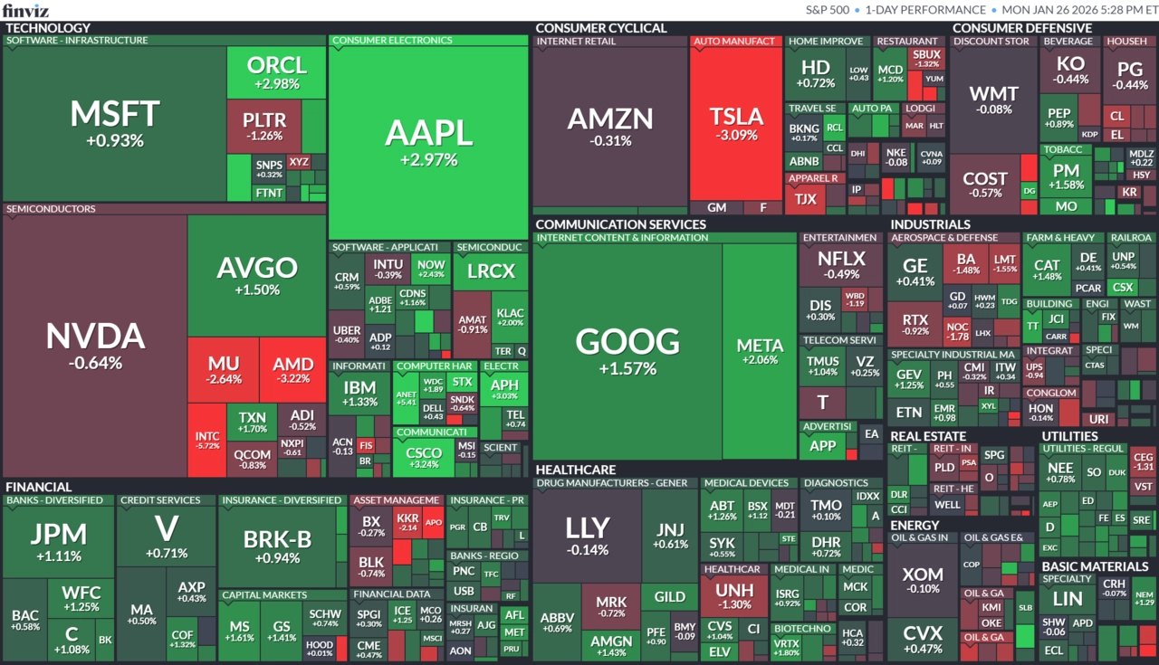 Index Dow posílil o 0,64 % na 49 412,40 bodu, širší S&P 500 vzrostl o 0,50 % na 6 950,23 bodu a technologický Nasdaq Composite přidal 0,43 % na 23 601,36 bodu, pouze index akcií malých firem Russell 2000 klesl o 0,36 % na 2 659,67 bodu. Index volatility VIX stoupl o 0,37 % na 16,15 bodu a výnos 10letých vládních dluhopisů USA klesl o dva a půl bazického bodu na 4,215 %. Ceny ropy klesly ani ne o půl procenta, ceny zlata a stříbra po úvodním prudkém vzestupu nakonec zdražily ani ne o procento a bitcoin zpevnil asi o dvě procenta na 88 150 USD.