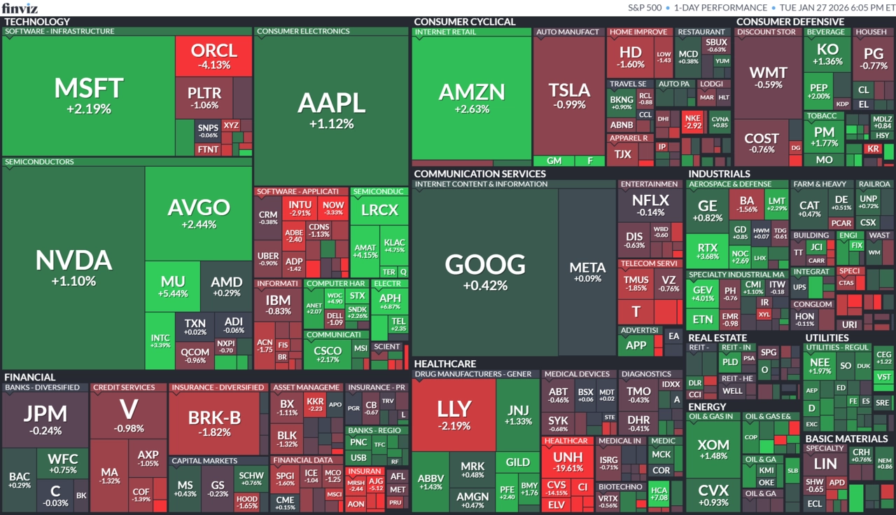 Investoři se soustředili hlavně na velké technologické firmy, které v týdnu zveřejňují výsledky hospodaření za uplynulý kvartál. Dařilo se zejména cenným papírům společnosti Apple (+1,12 %) a Microsoftu (+2,19 %). Během týdne zveřejní výsledky více než 90 firem z indexu S&P 500, přičemž ve středu reportují mimo jiné Microsoft, Meta Platforms a Tesla, ve čtvrtek pak Apple.