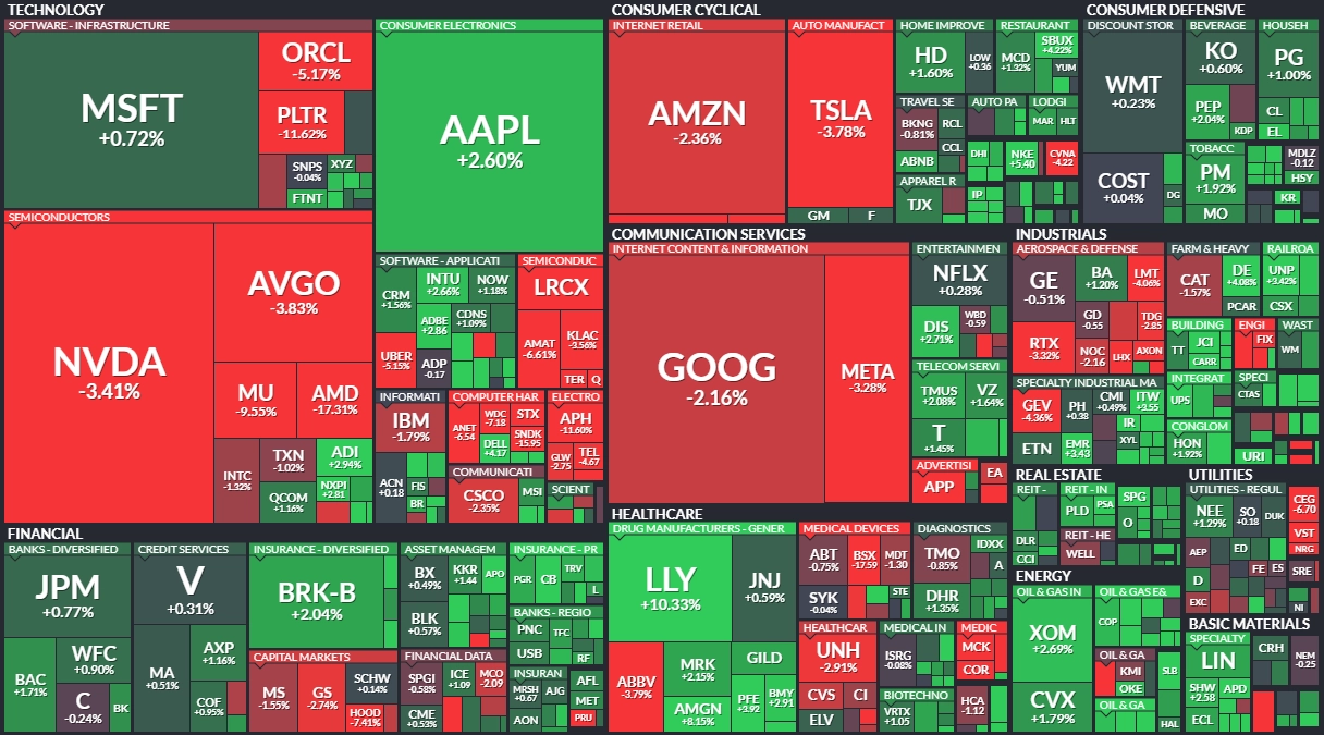 Pod tlakem zůstaly i akcie některých softwarových společností, cenné papíry Oraclu odepsaly 5,17 % a akie CrowdStrike odevzdaly 1,51 %. Našly se ale i pozitivní výjimky, třeba Microsoft (+0,72 %) nebo QUALCOMM (+1,16 %).