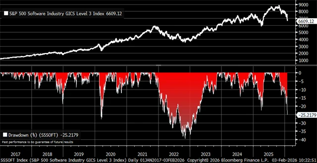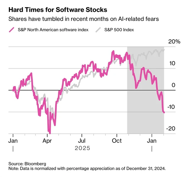 Akcie z odvětví softwaru v USA jsou stále pod prodejním tlakem. Z loňského vrcholu už odepisují přes 25 %. Takový propad nenastal ani v souvislosti se cly loni na jaře.