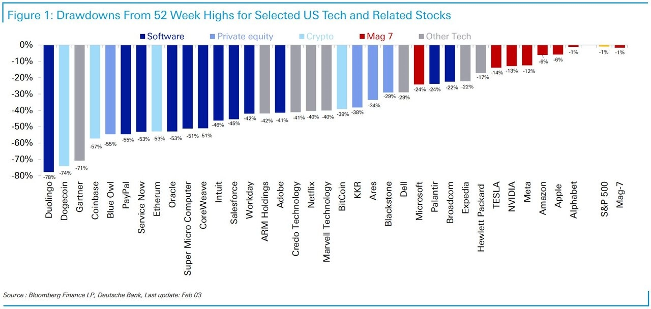 Tabulka je z 3. února. Od té doby některé uvedené investice dále oslabily. Celkem výrazně například bitcoin, který se ve čtvrtek dopoledne obchodoval v jednu chvíli těsně nad 70 000 USD, a z ročního maxima tak už ztrácel přes 43 %.