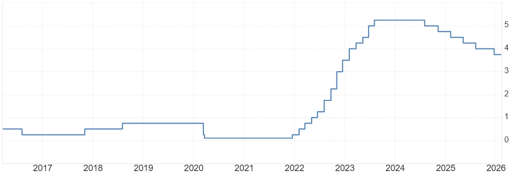 Britská centrální banka na únorovém zasedání v souladu s očekáváním potvrdila nastavení měnové politiky. Základní úroková sazba tak zůstává na úrovni 3,75 %.
