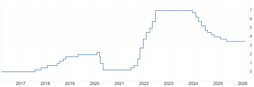 Bankovní rada ČNB začala uvolňovat měnovou politiku v prosinci 2023 poté, co rok a půl kvůli vysoké inflaci udržovala základní úrokovou sazbu na sedmi procentech. Nejprve sazbu snížila o 0,25 procentního bodu. Následovala čtyři dvojnásobná snížení, pak bankovní rada uvolňování měnové politiky opět zpomalila. Loni sazby klesly v únoru a květnu.