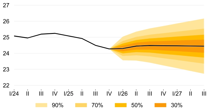 Kurz koruny k euru bude podle ČNB zhruba stabilní. Pro letošek centrální banka vyhlíží průměrný kurz 24,40 EUR/CZK a pro rok 2027 kurz 24,50 EUR/CZK.