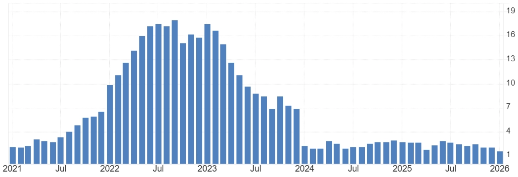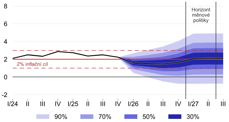 Podle makroekonomické prognózy zveřejněné na závěr únorového zasedání centrální banka čeká, že inflace se bude letos pohybovat pod 2 % a na počátku roku 2027 se vrátí do těsné blízkosti cíle. Konkrétně pro letošní rok ČNB vyhlíží průměrnou inflaci 1,6 % a pro rok 2027 růst cen tempem 2,1 %.