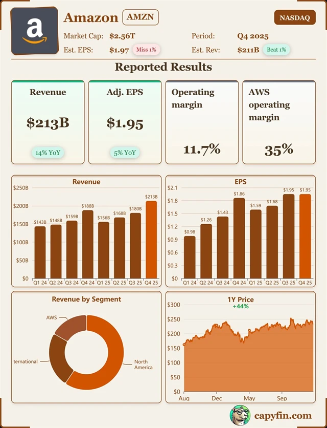 Cena akcií Amazonu se ve čtvrtečním after-marketu propadala o více než 10 % poté, co firma zveřejnila smíšené výsledky za čtvrté čtvrtletí a zároveň výrazně zvýšila výhled kapitálových výdajů na rok 2026 na 200 miliard dolarů. Zisk na akcii dosáhl 1,95 dolaru, byl tak mírně pod odhadem analytiků 1,97 dolaru, zatímco tržby překonaly očekávání a činily 213,39 miliardy dolarů. Investoři rovněž sledovali klíčové segmenty – cloudovou divizi AWS, která utržila 35,58 miliardy dolarů, a reklamní byznys s tržbami 21,32 miliardy dolarů. Oba tyto výsledky překonaly tržní konsenzus.