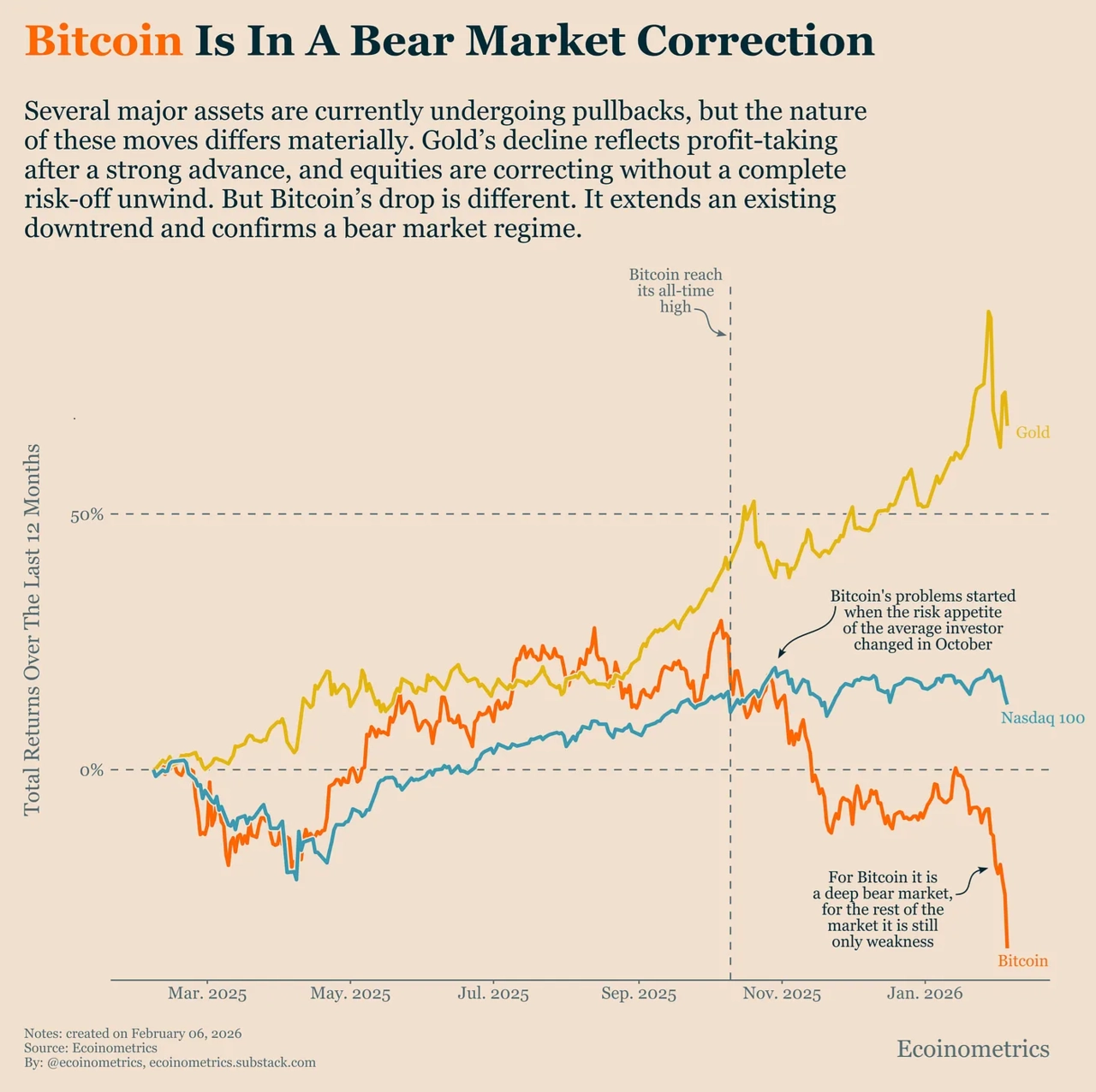 Poslední prudká vlna poklesů ceny bitcoinu se neodehrává v tržním vzduchoprázdnu. Výrazně oslabilo i zlato a pod tlakem jsou také akcie amerických technologických firem. Na první pohled může situace působit jako běžná plošná korekce trhů. Chyba lávky.