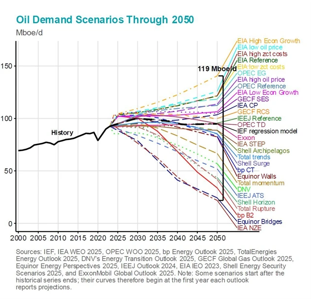 Do roku 2050 bude svět spotřebovávat obrovské množství ropy. A nebo skoro žádnou. Každoroční přehled všech hlavních scénářů vývoje poptávky po černém zlatě od International Energy Forum odhaluje pro polovinu 21. století rozdíl mezi nejvyšším a nejnižším odhadem okolo 119 milionů barelů denně. Mimochodem, to je více než současná celosvětová denní spotřeba.