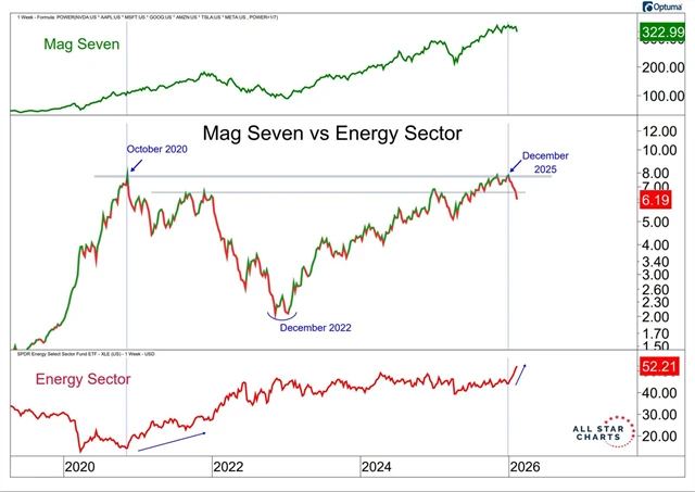 Akcie firem z takzvané úžasné sedmičky (Apple, Alphabet, Amazon, Meta Platforms, Microsoft, NVIDIA, Tesla) loni v prosinci dosáhly vrcholu ve srovnání s akciemi z energetického sektoru na stejné úrovni jako v říjnu 2020. Před pěti lety následovala zhruba dvouletá nadvýkonnost energetiky, tu přitom sledujeme i v poslední době. Náhoda?
