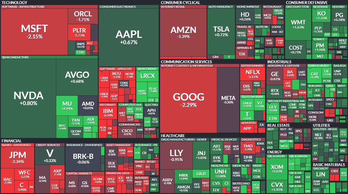 Index Dow klesl o 0,13 % na 50 121,40 bodu, širší S&P 500 odepsal kosmetických 0,34 bodu na 6 941,47 bodu a index technologického trhu Nasdaq Composite uzavřel se ztrátou 0,16 % na 23 066,47 bodu. Index volatility VIX sestoupil o 0,79 % na 17,65 bodu a výnos 10letých vládních dluhopisů USA se zvýšil o skoro tři bazické body na 4,172 %.