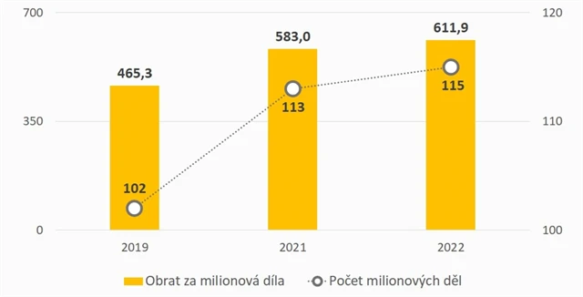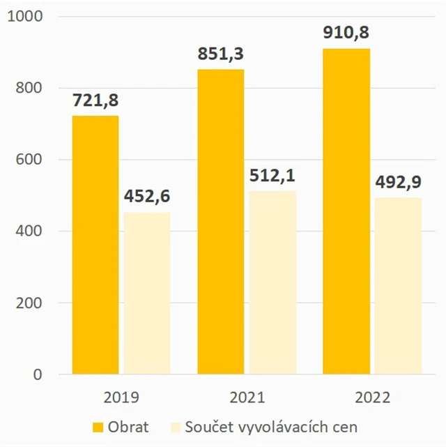 (obrat a průměrná cena včetně aukční provize v milionech Kč)
