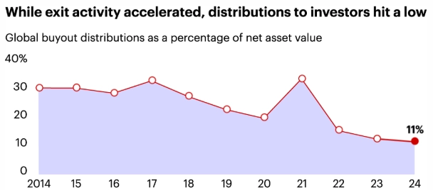 Slabší aktivita při odprodejích firem (exit activity) má dalekosáhlé následky. Private equity fondy jsou závislé na tom, že investorům budou vracet kapitál, aby ti ho mohli znovu vložit do nových fondů. Pokud exity nejdou podle plánu, vyplácení podílů prudce klesá, a tím trpí i získávání nových investic (fundraising). Podle Bain PE Midyear Report 2025 vybraly fondy mezi červnem 2024 a červnem 2025 jen 592 miliard dolarů, nejméně za posledních sedm let. A konkurence je obrovská, více než 18 tisíc fondů celosvětově shání kolem 3,3 bilionu dolarů. I velké fondy musely dramaticky snížit cíle. Například Insight Partners proměnili plánovaných 20 miliard dolarů sotva v polovinu.