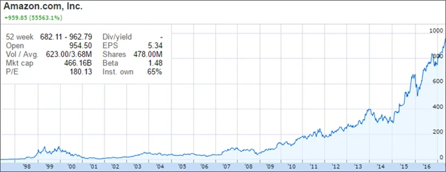 20 let akcií Amazonu na burze | zdroj: Google Finance