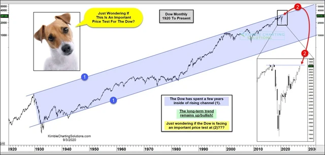 V tom dlouhodobějším, pravda, si Kimble občas "hraje" i s horizonty, které do smysluplné technické analýzy až tak nepatří. V tomto týdnu například přišel s grafem, ve kterém sice klade důraz na celkem uvěřitelnou rezistenci na historickém maximu (možný dvojitý vrchol), nicméně vykresluje i 90leté období a v něm linii rezistence, na kterou má (tedy do čtvrtka měl) narážet index Dow. Takže všeho s mírou, Chrisi.
