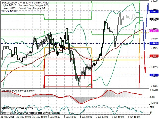 Předpokládaný pohyb pro dnešní den LONG. Případné vstupy do obchodu z hladiny 1.441 s předpokládaným cílem 1.452, případně až 1.4545. Proražení hladiny 1.44 může vést k pohybu s pravděpodobným cílem 1.434 až 1.43.