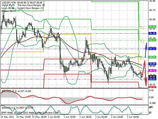Předpokládaný pohyb pro dnešní den SHORT. Případné vstupy do obchodu z hladiny 80.95 s předpokládaným cílem 80.55, případně až 80.4. Proražení hladiny 81 může vést k pohybu s pravděpodobným cílem 81.2 až 81.4.