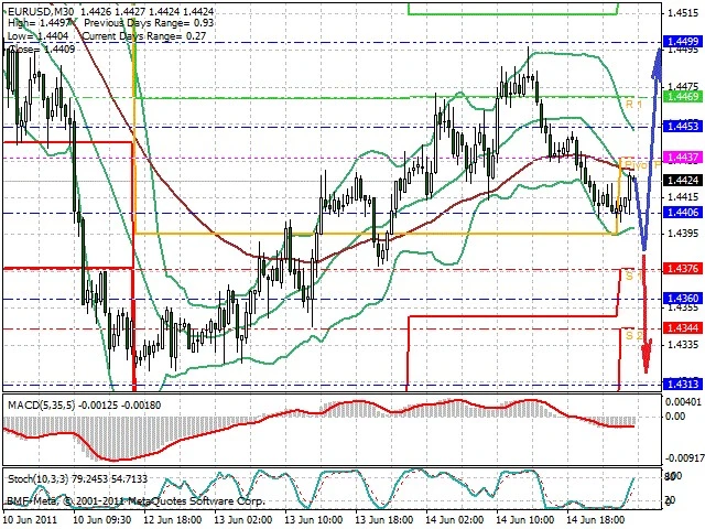 Předpokládaný pohyb pro dnešní den LONG. Případné vstupy do obchodu z hladiny 1.4385 s předpokládaným cílem 1.4455, případně až 1.45. Proražení hladiny 1.4375 může vést k pohybu s pravděpodobným cílem 1.432 až 1.43.