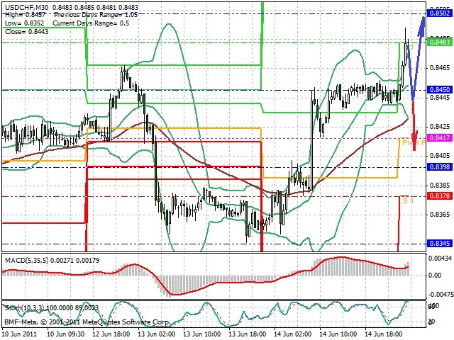 Předpokládaný pohyb pro dnešní den LONG. Případné vstupy do obchodu z hladiny 0.844 s předpokládaným cílem 0.85, případně až 0.852. Proražení hladiny 0.844 může vést k pohybu s pravděpodobným cílem 0.841 až 0.839.