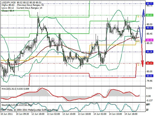 Předpokládaný pohyb pro dnešní den LONG. Případné vstupy do obchodu z hladiny 80.35 s předpokládaným cílem 80.7, případně až 80.9. Proražení hladiny 80.3 může vést k pohybu s pravděpodobným cílem 80.1 až 80.