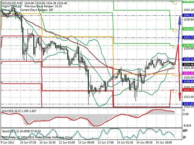 Předpokládaný pohyb pro dnešní den SHORT. Případné vstupy do obchodu z hladiny 1 530 s předpokládaným cílem 1 512, případně až 1 505. Proražení hladiny 1 530 může vést k pohybu s pravděpodobným cílem 1 537 až 1 545.