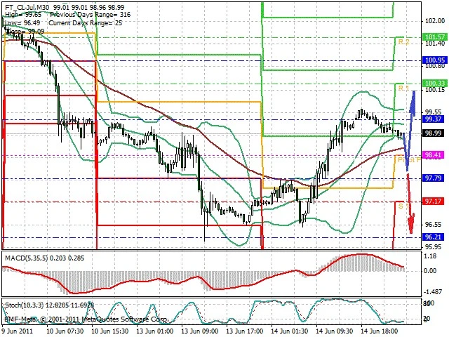 Předpokládaný pohyb pro dnešní den LONG. Případné vstupy do obchodu z hladiny 98 s předpokládaným cílem 100.1, případně až 101. Proražení hladiny 98 může vést k pohybu s pravděpodobným cílem 96.7 až 96.2.