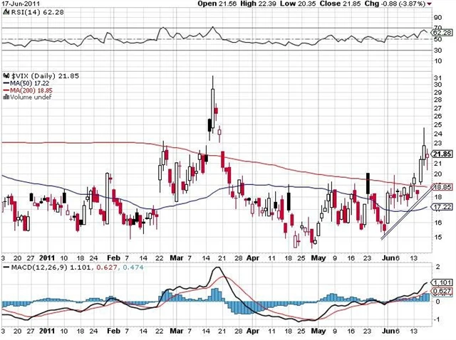 VIX hned v pondělí uzavřel nad hladinou 19 a naznačil možnost dalšího propadu trhů. Po klidnějším úterním obchodování a ve středu uzavřel nad hodnotou 20, kde byl naposledy v březnu. Vytvořil rostoucí trendovou čáru, což je medvědí signál pro akcie. Situaci změní jasné uzavření pod rostoucí trendovou čárou, tj. na hodnotě pod 18.