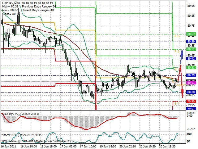 Předpokládaný pohyb pro dnešní den SHORT. Případné vstupy do obchodu z hladiny 80.35 s předpokládaným cílem 80, případně až 79.9. Proražení hladiny 80.4 může vést k pohybu s pravděpodobným cílem 80.5 až 80.7.
