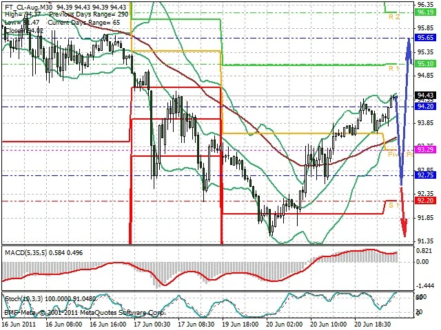 Předpokládaný pohyb pro dnešní den LONG. Případné vstupy do obchodu z hladiny 92.5 s předpokládaným cílem 94.6, případně až 95.95. Proražení hladiny 92.5 může vést k pohybu s pravděpodobným cílem 91.4 až 90.25.
