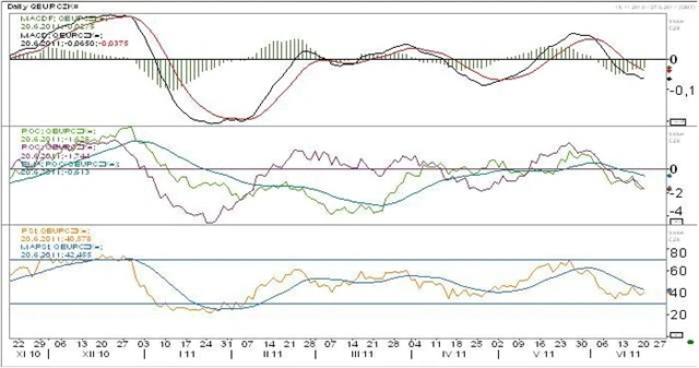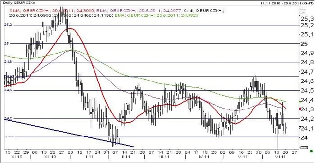 Technická analýza EURCZK ukazuje poslední dny na konsolidaci kurzu v rozmezí 24,00-24,20 s mírným tlakem na další posilování CZK. Jak nám však ukazují sledované indikátory MACD, ROC a RSI, je patrná překoupenost CZK vůči EUR. Proto v nejbližších dnech očekáváme, že psychologická hranice 24,00 odolá. Spíše vidíme prostor pro mírné oslabení koruny.
