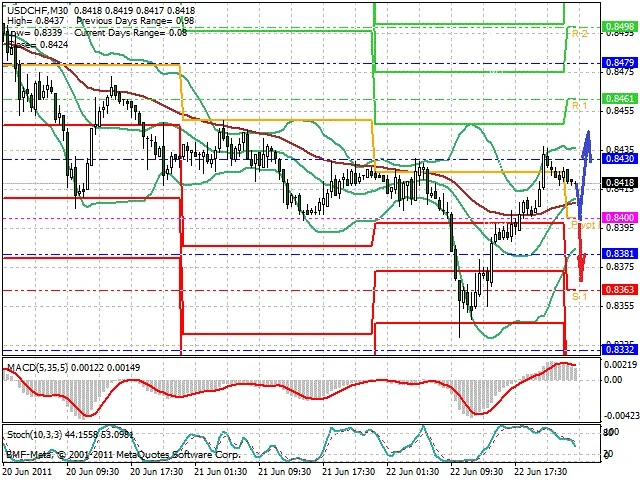 Předpokládaný pohyb pro dnešní den LONG. Případné vstupy do obchodu z hladiny 0.84 s předpokládaným cílem 0.844, případně až 0.847. Proražení hladiny 0.84 může vést k pohybu s pravděpodobným cílem 0.837 až 0.834.