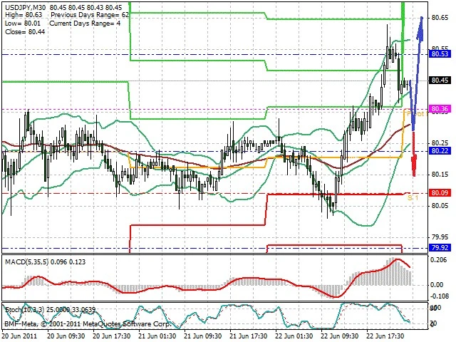 Předpokládaný pohyb pro dnešní den LONG. Případné vstupy do obchodu z hladiny 80.3 s předpokládaným cílem 80.65, případně až 80.8. Proražení hladiny 80.25 může vést k pohybu s pravděpodobným cílem 80.15 až 80.