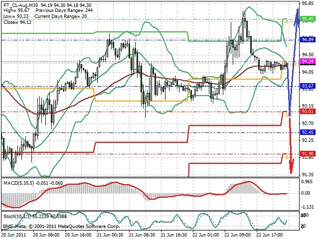 Předpokládaný pohyb pro dnešní den LONG. Případné vstupy do obchodu z hladiny 92.85 s předpokládaným cílem 95.7, případně až 97.18. Proražení hladiny 92.85 může vést k pohybu s pravděpodobným cílem 91.4 až 90.