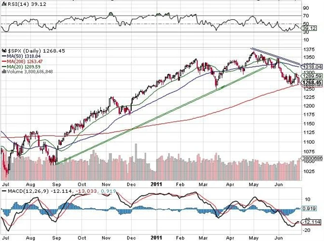 Rezistence je nyní v oblasti 1 300, kde byla úterní a středeční maxima (1 298), a nad ní pak v oblasti 1 310 až 1 315, kde se vyskytovaly minimální denní ceny na koci května. Uzavření nad vyšší hladinou odporu by změnilo graf na neutrální. Dokud je index S&P 500 pod 1 315, graf zůstává v medvědím uskupení.
